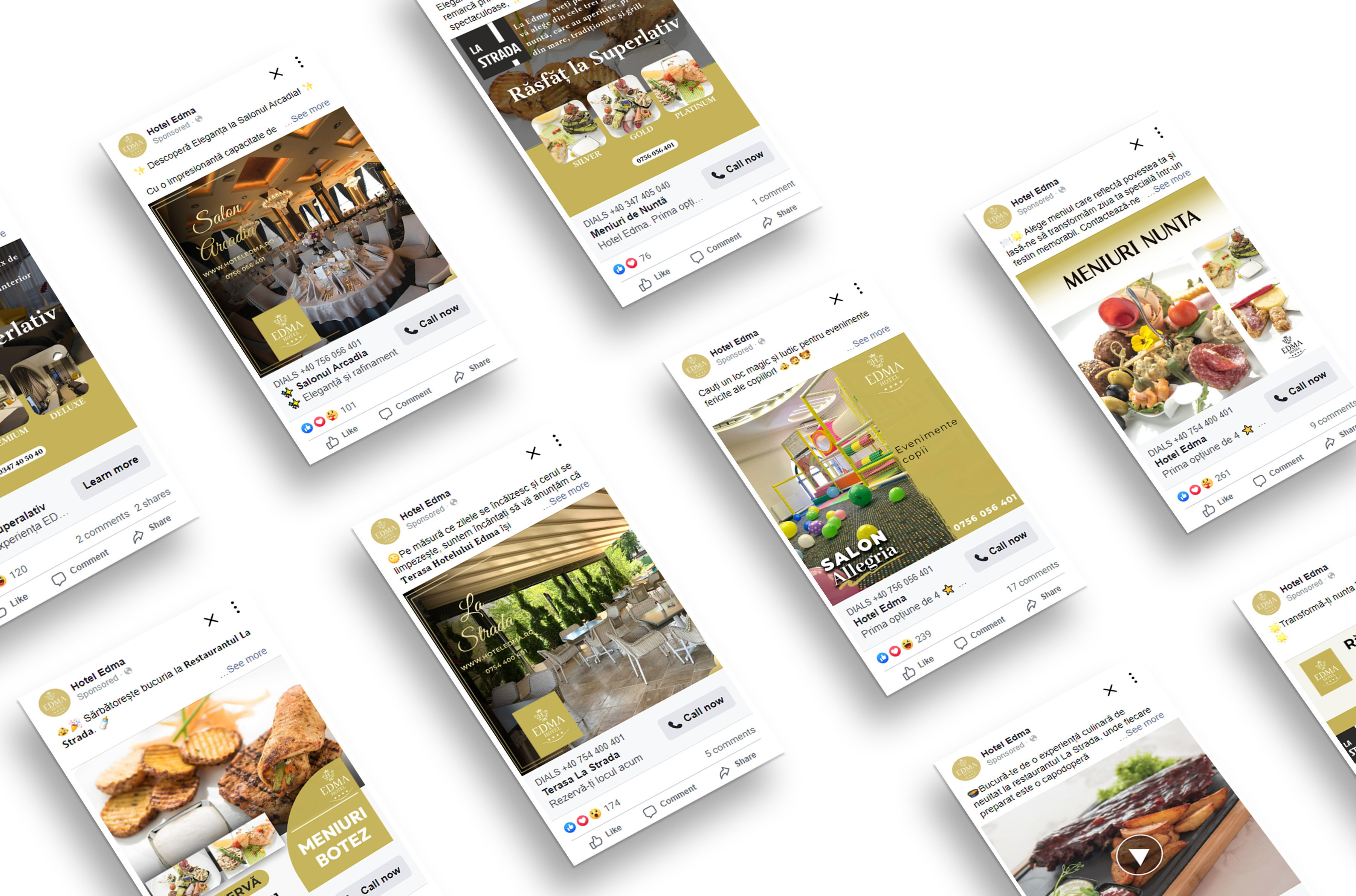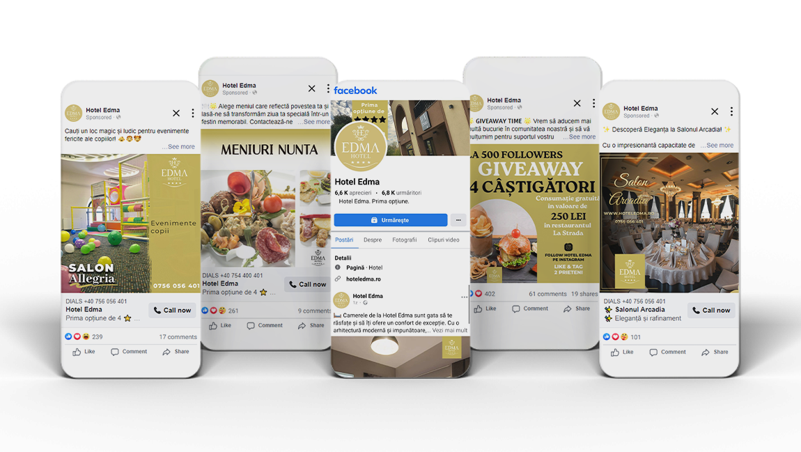 - Realizare Materiale Creative: Am creat imagini și conținut vizual pentru fiecare serviciu oferit de Hotel Edma, asigurându-ne că fiecare aspect al hotelului este prezentat într-un mod atractiv și profesional. Pentru hotel și restaurant, am realizat materiale creative cu imagini ale spațiului de cazare și ale preparatelor culinare, prezentând facilitățile hotelului și meniurile restaurantului.