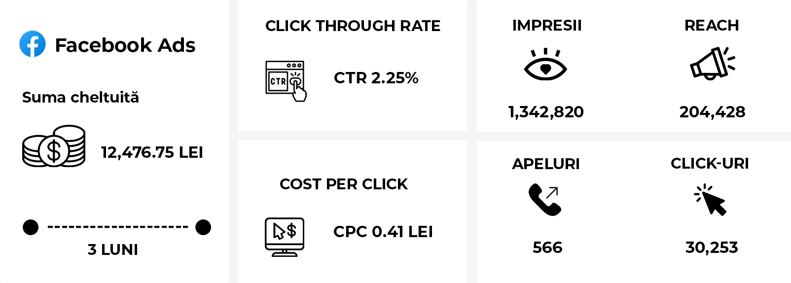 CPC-ul de 0.41 lei și costul per apel de 16.5 lei indică o utilizare eficientă a bugetului, asigurând un bun raport cost-eficiență. Aceste rezultate reflectă succesul strategiilor implementate, relevanța conținutului și atractivitatea reclamelor, contribuind la o interacțiune mai mare cu publicul țintă și la creșterea potențialului de conversie.