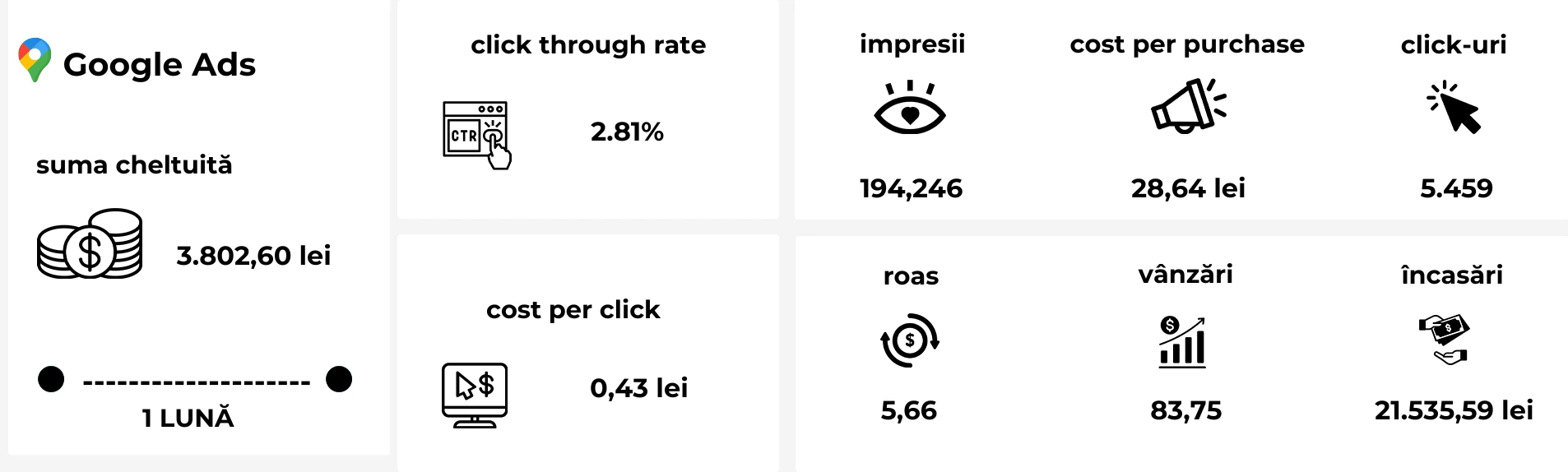 Buget investit: 456,21 lei - Valoare conversii: 8.693,57 lei